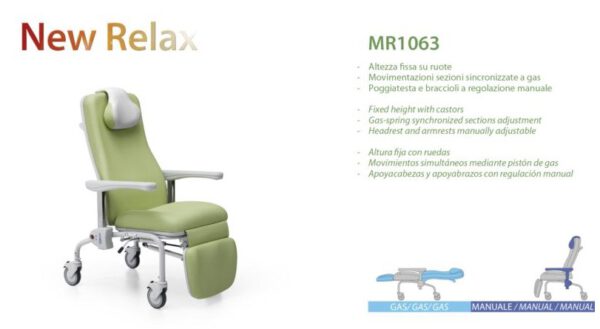 Givas behandelstoel type Sincro met vaste zithoogte en gesynchroniseerde sectieverstelling voorzien van gasveer. De MR1063 is uitgevoerd met 4 zwenkwielen waarmee de rijrichting kan worden vast gezet, de achterwielen zijn beremd. De Sincro is bijzonder geschikt voor patiënten met een goede mobiliteit en het vermogen om autonoom te bewegen.