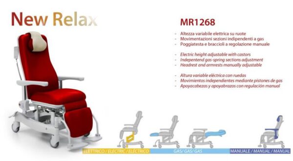De bewezen betrouwbaarheid en veelzijdigheid van dit product maakt het geschikt voor elk type patiënt. De zitting en de rugleuning geven goede ondersteuning en zijn gemaakt van multiplex en schuimvulling, beide zijn brandwerend, visco-elastisch en thermisch gevormd voor maximaal comfort en ter voorkoming van decubitus. De wegklapbare armleuningen zijn gemaakt van zacht polyurethaan. De voetsteunen kunnen worden gedraaid en zijn voorzien van een automatische draaiblokkering voor het uitstappen van de patiënt. De MR1268 is uitgevoerd met 4 zwenkwielen waarmee de rijrichting kan worden vast gezet, de achterwielen zijn beremd.