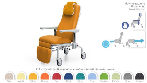 Givas behandelstoel type Free met vaste zithoogte en onafhankelijke sectieverstelling voorzien van gasveer. De Free is specifiek ontworpen om te voldoen aan de behoeften van patiënten met een matige mobiliteit om naar een afdeling te gaan.
