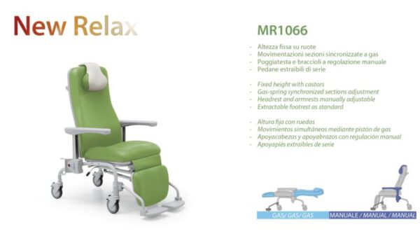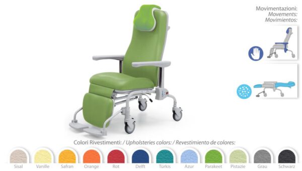 Givas behandelstoel type Sincro met vaste zithoogte en gesynchroniseerde sectieverstelling voorzien van gasveer en wegklapbare voetsteunen. De MR1066 is uitgevoerd met 4 zwenkwielen waarmee de rijrichting kan worden vast gezet, de achterwielen zijn beremd. Het platform is draaibaar voor eenvoudige bediening en comfort. De Sincro is bijzonder geschikt voor patiënten met een goede mobiliteit en het vermogen om autonoom te bewegen.