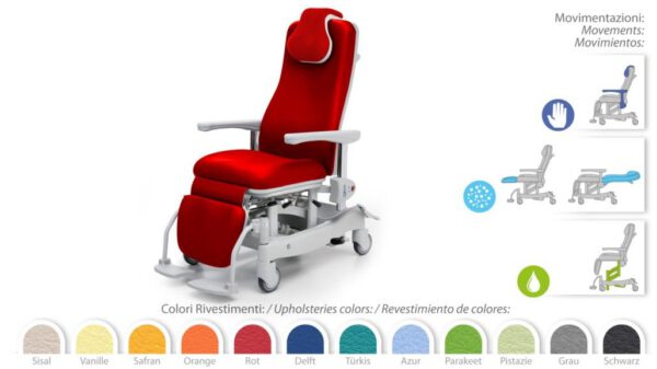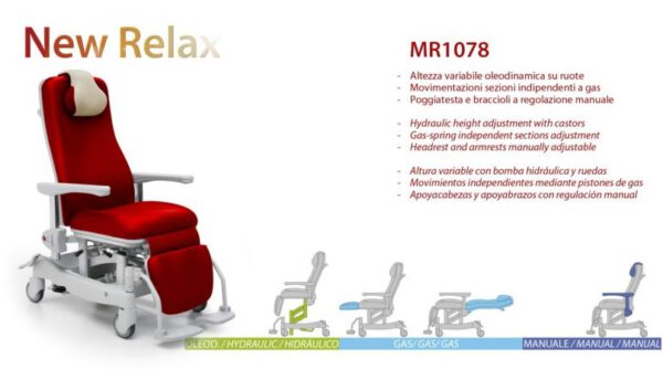 Specifiek voor patiënten met beperkte mobiliteit, is de Vario Oleo-D uitgerust met een variabele hydraulische hoogteverstelling voorzien van een stevig stalen frame. De zitting en de rugleuning geven goede ondersteuning en zijn gemaakt van multiplex en schuimvulling, beide zijn brandwerend, visco-elastisch en thermisch gevormd voor maximaal comfort en ter voorkoming van decubitus. De wegklapbare armleuningen zijn gemaakt van zacht polyurethaan. De voetsteunen kunnen worden gedraaid en zijn voorzien van een automatische draaiblokkering voor het uitstappen van de patiënt. De MR1076 is uitgevoerd met 4 zwenkwielen waarmee de rijrichting kan worden vast gezet, de achterwielen zijn beremd.