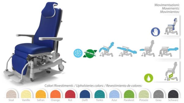 Givas behandelstoel type Various oil-D TREND met hydraulisch variabele hoogte, onafhankelijke bewegingen en trendelenburgstand.